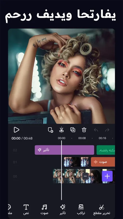 لإنشاء أول مشروع بعد تثبيت برنامج VivaCut Pro اضغط على زر New Project ثم حدد نسبة العرض المناسبة مثل 16:9 لمنصات الفيديو الطويلة أو 9:16 للمحتوى العمودي أو 1:1 للمقاطع المربعة. بعد ذلك اختر الفيديوهات والصور من معرض الهاتف، ويمكن تحديد ملف واحد أو عدة ملفات دفعة واحدة بسهولة. بمجرد التأكيد ستنتقل إلى واجهة التحرير الكاملة التي تتضمن جدولًا زمنيًا Timeline في الأسفل لعرض المقاطع على شكل طبقات، وفي الأعلى شاشة معاينة مباشرة، مع شريط أدوات جانبي يحتوي على جميع خيارات التعديل والمؤثرات.