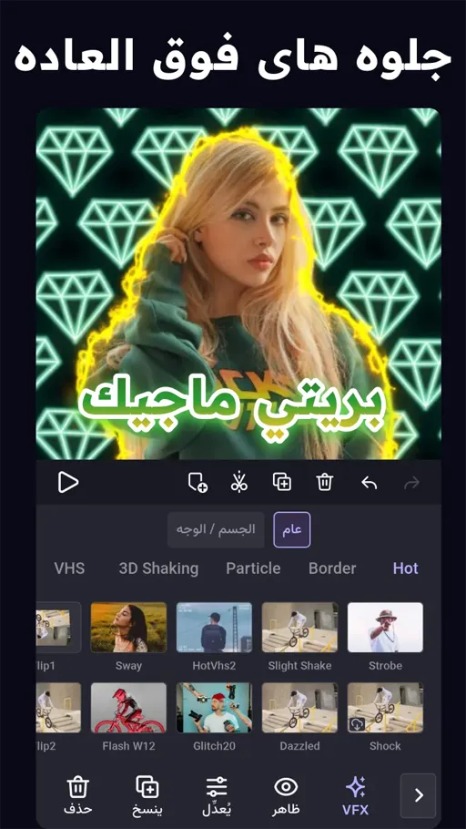 - مكتبة تأثيرات ضخمة : يقدم تحميل تطبيق VivaCut Pro مهكر مكتبة شاملة تضم مئات التأثيرات البصرية والفلاتر والانتقالات الجاهزة للاستخدام الفوري. تشمل المكتبة تأثيرات شهيرة مثل Glitch وVHS وBlur وGlow وShake بالإضافة إلى فلاتر سينمائية تضيف أجواء احترافية للمشاهد. جميع التأثيرات قابلة للتخصيص من حيث الشدة والمدة وطريقة التطبيق، مما يمنحك مرونة كاملة في ضبط التفاصيل الدقيقة حسب متطلبات مشروعك. تساعد هذه المكتبة الضخمة في تسريع عملية التحرير وتوفير نتائج جذابة دون الحاجة لاستخدام برامج إضافية، لتصميم فيديوهات مميزة تنافس الأعمال الاحترافية بسهولة.